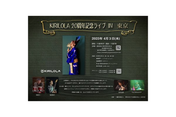 KIRILOLA20周年記念ライブ IN 東京 4月 3 Thu 2025 KIRILOLA 縄文岩系アーティスト(唄、舞、鳴り物) 岡部洋一(Per) 鬼怒無月(G) Koji Matsumoto(ディジュリドゥ) 坂本弘道(Vc, etc) 開場18:30 開演19:00 入場 ¥4500 +1drink別 当日¥5000 +1drink別 来店順の入場。 入場予約はこちらへ Tweet Share +1 Hatena Pocket RSS feedly Pin it 前のスケジュール 次のスケジュール