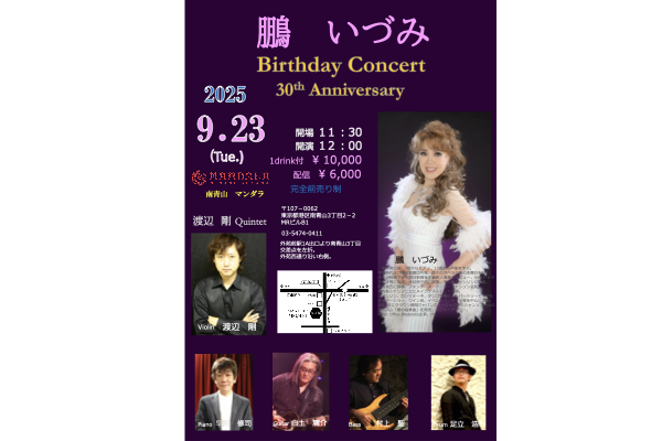 鵬いづみ バースデーコンサート 30th Anniversary 9月 23 Tue 2025 鵬いづみ バースデーコンサート 30th Anniversary 演奏:渡辺剛クィンテット [ 早川修司(Pf) 渡辺 剛(Vn) 白𡈽庸介(G) 村上 聖(B) 足立 浩(Drs) ] 開場11:30 開演12:00 入場 ¥10,000 (1drink付) 配信 ¥6,000 Tweet Share +1 Hatena Pocket RSS feedly Pin it 前のスケジュール 次のスケジュール