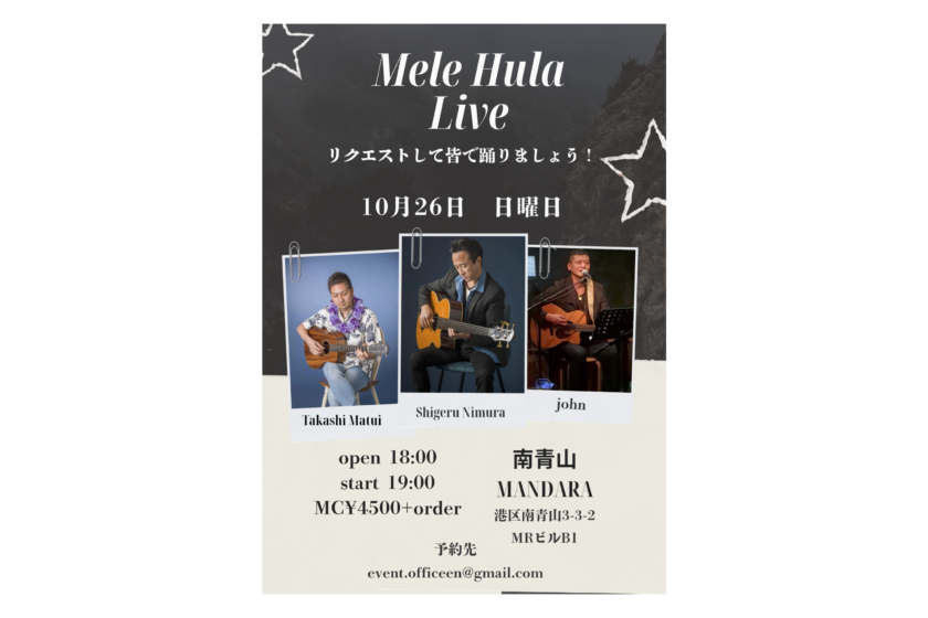 <night> Mele Hula Live 仁村茂 松井貴志 山田john泰介 10月 26 Sun 2025 <Mele Hula Live> 仁村 茂 松井 貴志 山田john泰介 開場18:00 開演19:00 入場 ¥4,500 +order 予約はこちらへ Tweet Share +1 Hatena Pocket RSS feedly Pin it 前のスケジュール 次のスケジュール