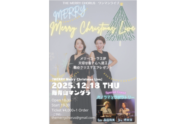 <MERRY Merry Christmas Live> 12月 18 Thu 2025 <MERRY Merry Christmas Live> THE MERRY CHORUS ゲスト:パノラマとラボラトリー 森田珠美(Key) 坪井洋(Drs) 開場18:30 開演19:30 入場 ¥4,000 / ¥4,500 +1drink別 11/3 より予約開始 予約はこちらへ Tweet Share +1 Hatena Pocket RSS feedly Pin it 前のスケジュール 次のスケジュール