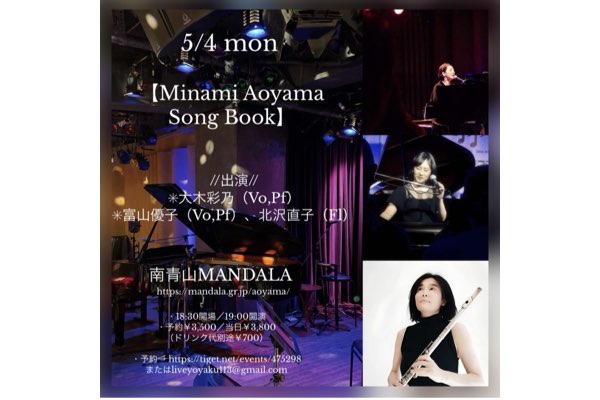 <night> 大木彩乃 / 富山優子 5月 4 Mon 2026 <Minami Aoyama Song Book> 大木彩乃(Vo,Pf) 富山優子(Vo,Pf) 北沢直子(Fl) 開場18:30 開演19:00 入場 ¥3,500 / ¥3,800 +1drink別 予約はこちらへ Tweet Share +1 Hatena Pocket RSS feedly Pin it 前のスケジュール 次のスケジュール